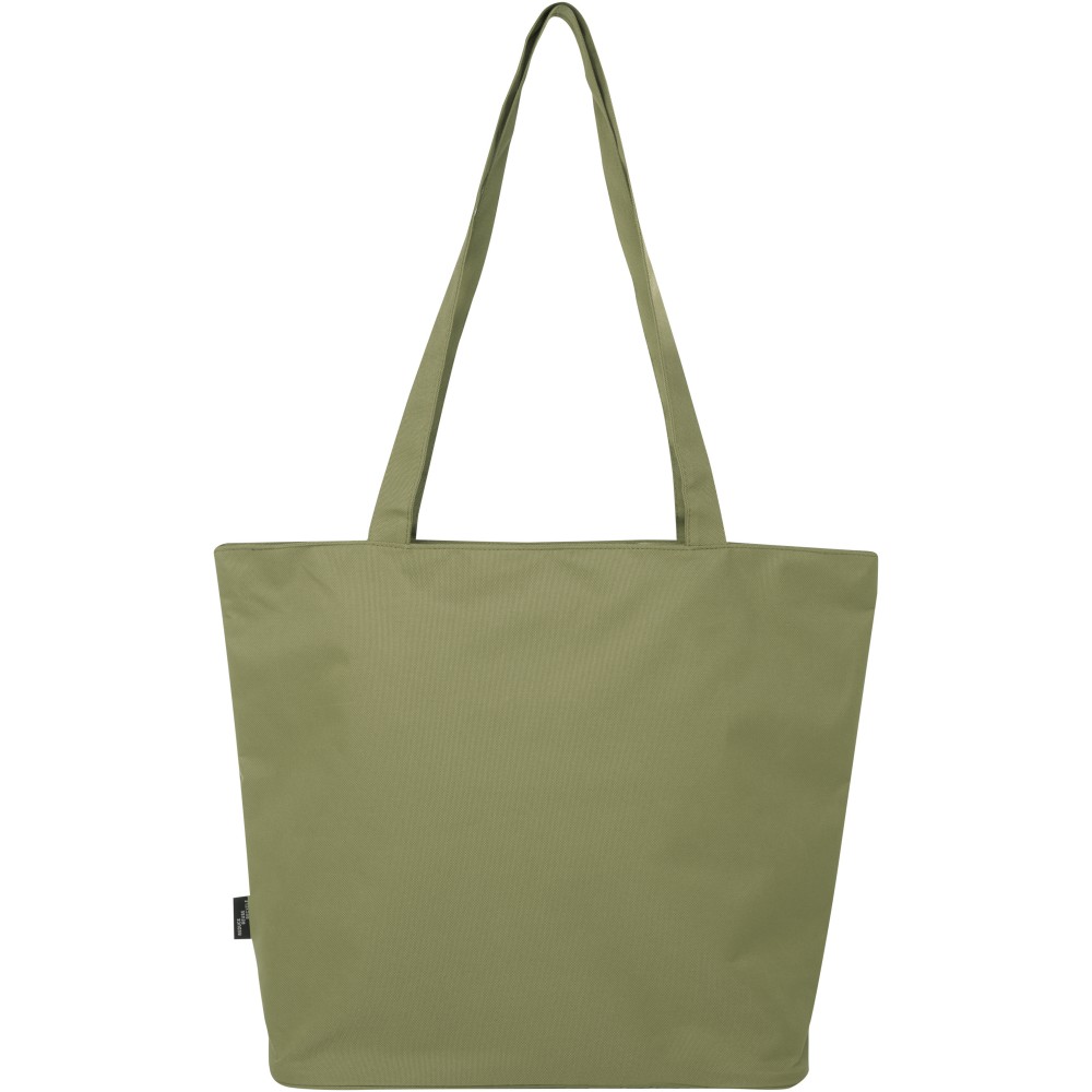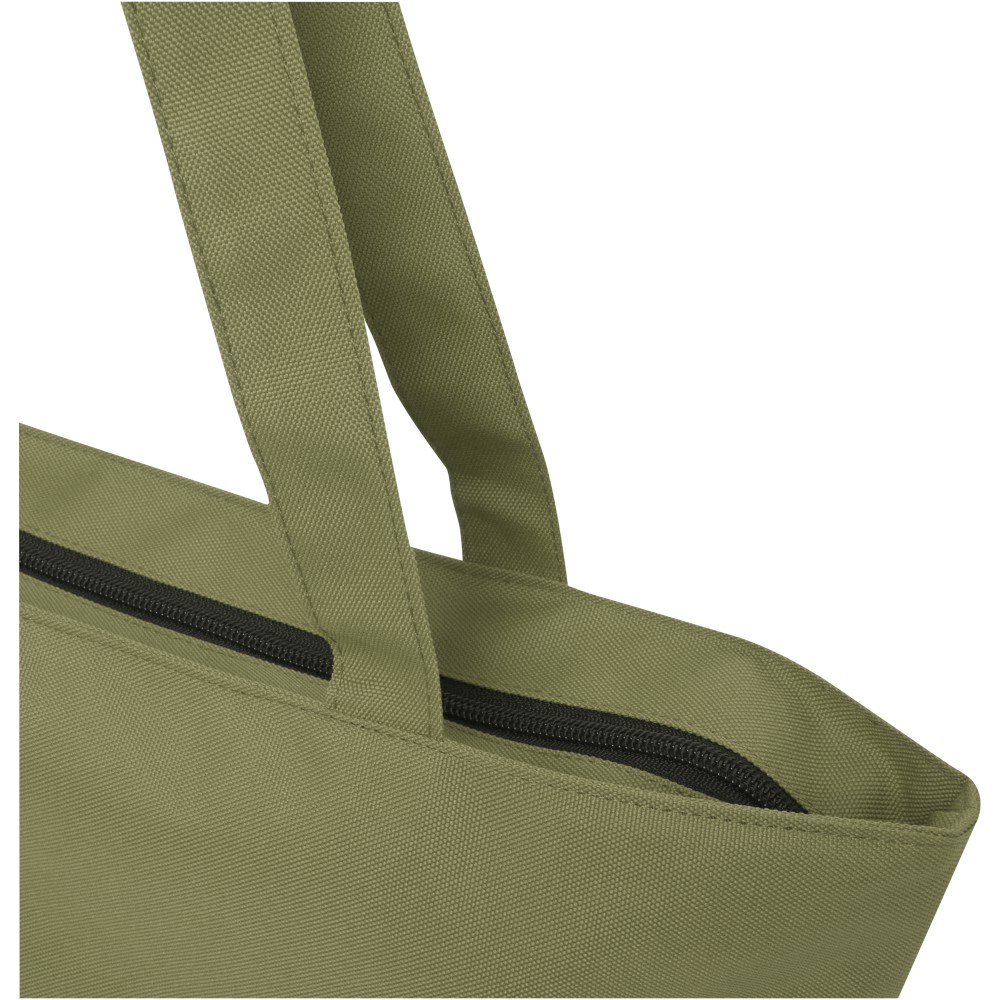 A vízlepergető 600D rPET anyagból készült Panama GRS újrahasznosított cipzáras táska tökéletes és fenntartható választás, ha rendezvényre, strandra vagy bevásárlásra készülsz. Egy cipzáras főrekesszel és egy cipzáras belső zsebbel rendelkezik, amely elég nagy a telefonod vagy más értékes holmi tárolására. Fülei 34 cm hosszúak, ezért a táska könnyen hordozható vállon. Teherbírás: 10 kg. PVC-mentes.