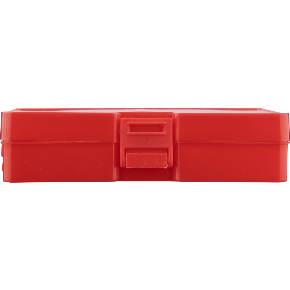 PP anyagból készült elsősegélykészlet piros tokban, a felső részen fehér kereszttel és csatos záródással. Tartalma: 2 nemszőtt törlőkendő, 5 ragtapasz, 4 alkoholos törlőkendő, 1 olló, 1 tekercs 450 cm hosszú gézkötés és 1 tekercs 450 cm hosszú ragasztószalag.