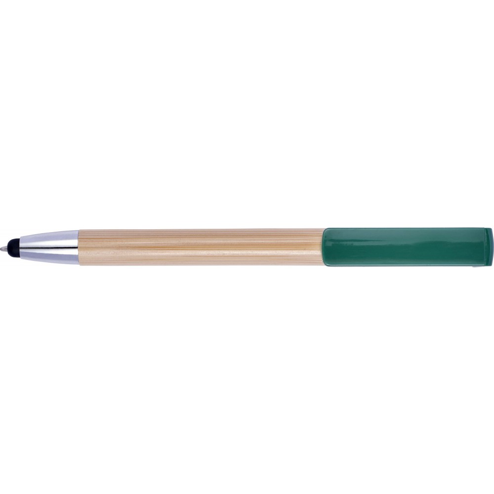 Golyóstoll és érintő kék tollbetéttel, műanyag klipsszel és nyomógombbal. A klipsz nyomógombként funkcionál, és okostelefon-állványként is használható. ABS, bambusz.
