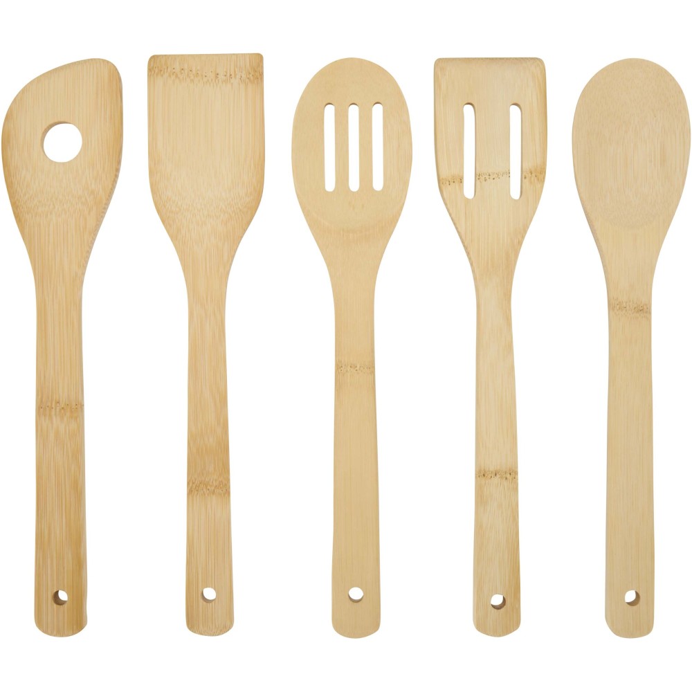 Bambusz konyhai spatula készlet a hozzá illő tárolóval, amelyet tartós, könnyű és tapadásmentes edényekhez is biztonságos használatra terveztek. Ez a természetes anyagból készült szett ideális a mindennapi főzéshez, és segít a konyha rendszerezésében. A készlet tartalmaz egy kanalat (29,8 × 5,8 cm), egy szűrőkanalat (29,8 × 5,8 cm), egy fordítólapátot (30,3 × 6,1 cm), egy lyukas fordítólapátot (30 × 6 cm), valamint egy lyukas spatulát (30 × 6 cm). A megbízható használat érdekében minden eszköz 0,8 cm vastagságú anyagból készült.