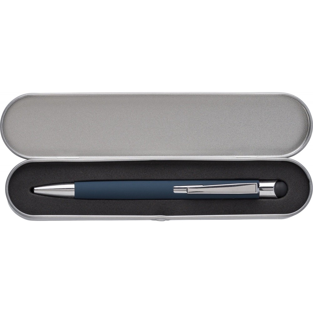 Golyóstoll gumis bevonattal, érintővel, fekete tollbetéttel. Csomagolása fém tolldoboz. Alumínium.