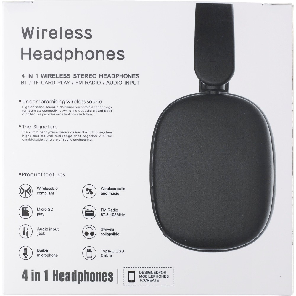 Vezeték nélküli on-ear fejhallgató 250 mAh kapacitású akkumulátorral. Type-C csatlakozás. Lejátszási idő kb. 10 óra, készenléti idő kb. 200 óra. Töltési idő: 2 óra. FM rádióval, TD kártyahely lehetőséggel és 5.3 vezeték nélküli kapcsolattechnológiával rendelkezik. Frekvenciatartomány: 20-20 000 Hz. 32 ohm, decibel érték: 105 dB š 3 dB. Vezeték nélküli hatótávolság: 10-20 méter. Darabonként csomagolva, töltőkábellel és használati útmutatóval, ajándékdobozban. ABS műanyag.