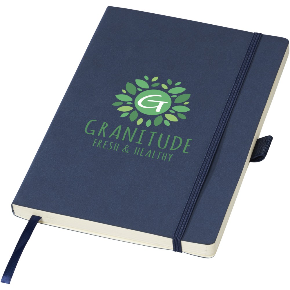 Puha borítású (A/5) jegyzetfüzet, gumis záródással, jelölővel, tolltartó hurokkal, hátoldalán zsebbel jegyzetek tárolására. 80 db krém színű vonalas (80gsm) lappal. Fekete papírhüvelybe csomagolva.