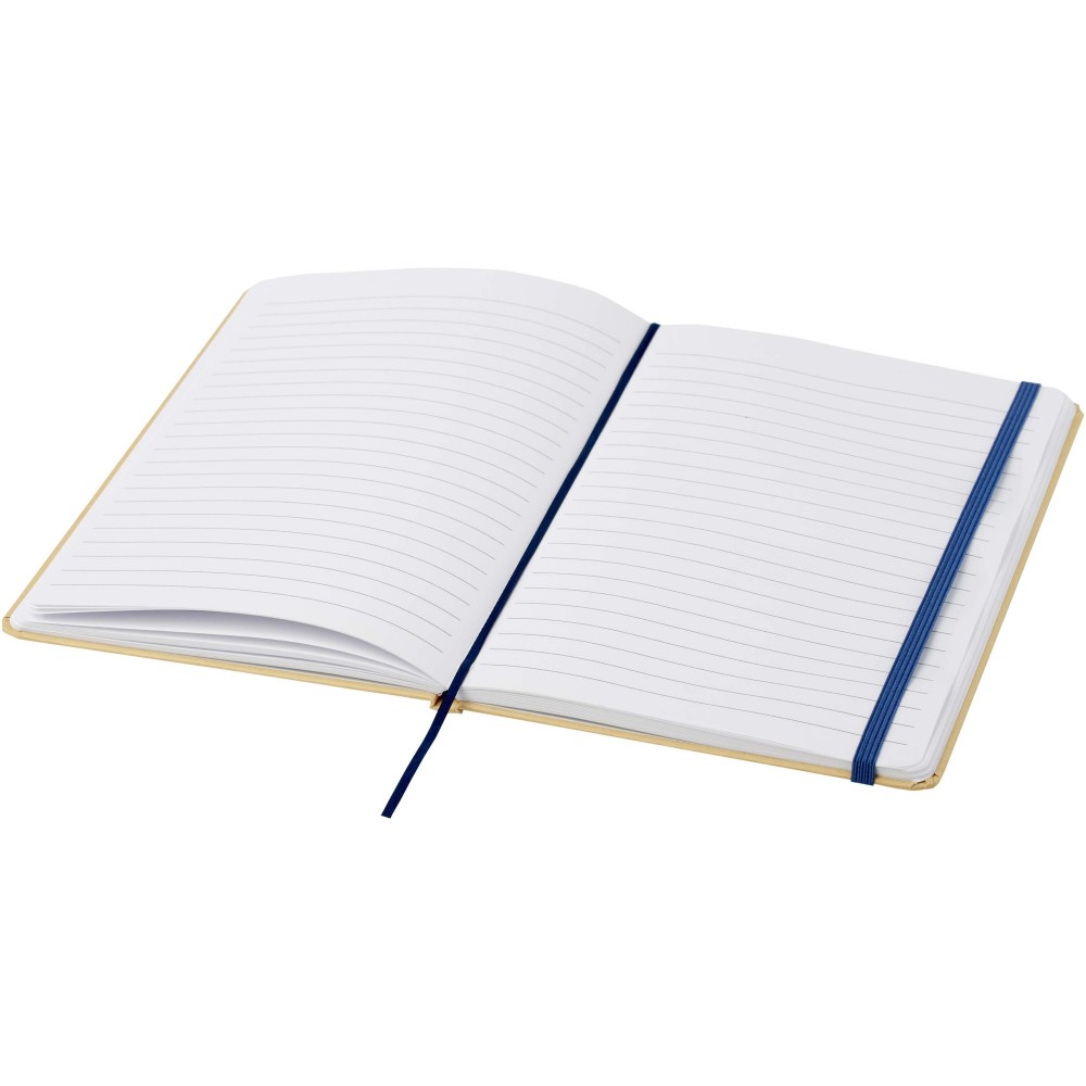 Kemény fedeles A5 jegyzetfüzet újrahasznosított kartonból, 80 soros, 70 g/m2 papírlappal. A jegyzetfüzet gumis záródással, szalaggal és lekerekített sarkokkal rendelkezik.
