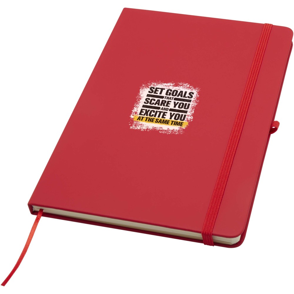 A Spectrum Plus A5 keményfedeles jegyzetfüzet lekerekített sarkokkal nemcsak az irodai mindennapok elengedhetetlen kelléke, hanem remek lehetőség márkád népszerűsítésére is. A jegyzetfüzet puha tapintású borítóval rendelkezik és 80 vonalas, krémszínű, 70 g/m2-es lapból áll, amely tökéletes gyors ötletek vagy hosszabb jegyzetek rögzítésére. A jegyzetfüzet tolltartó hurokkal, gumiszalagos záródással, könyvjelzővel és harmonikazsebbel van ellátva.