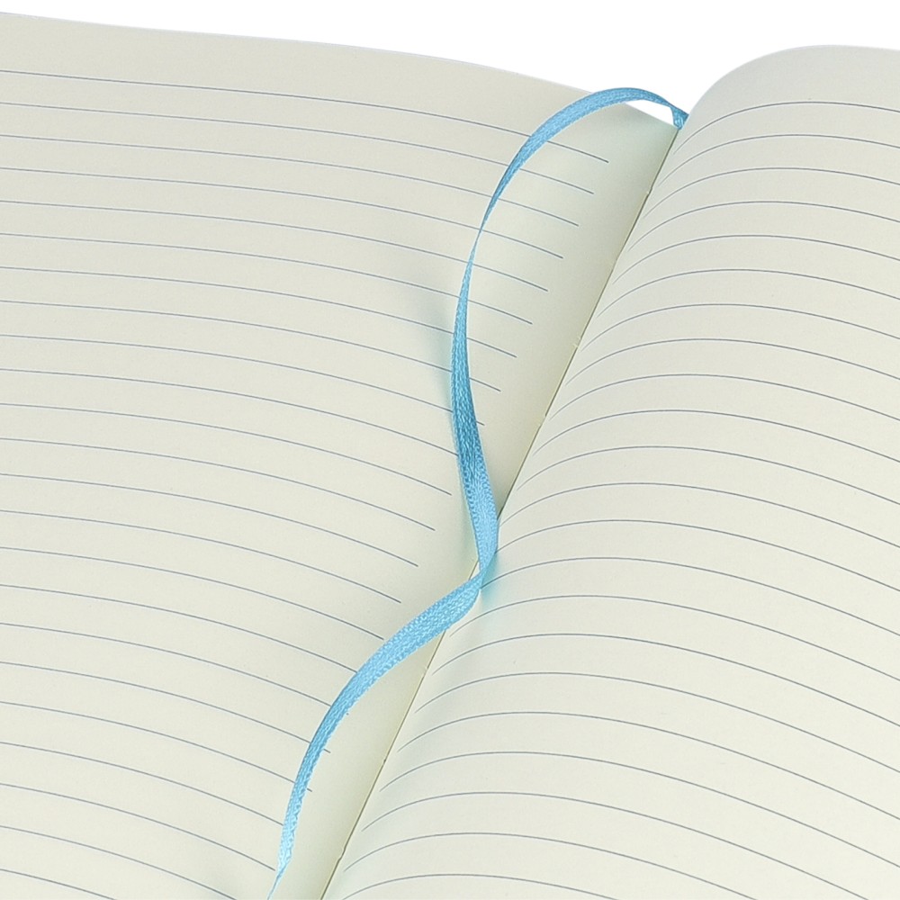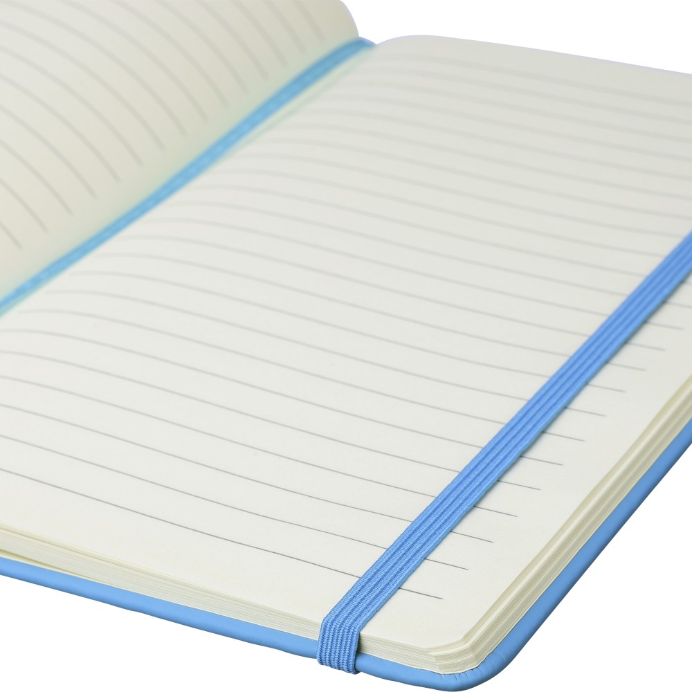 A5-ös méretű jegyzetfüzet rPET PU anyagból készült kemény borítóval, 80 vonalas lappal (70g/m2), színben illeszkedő gumipánttal és könyvjelző szalaggal. Az újrahasznosított anyagra utaló dombornyomott logóval a füzet hátoldalán.