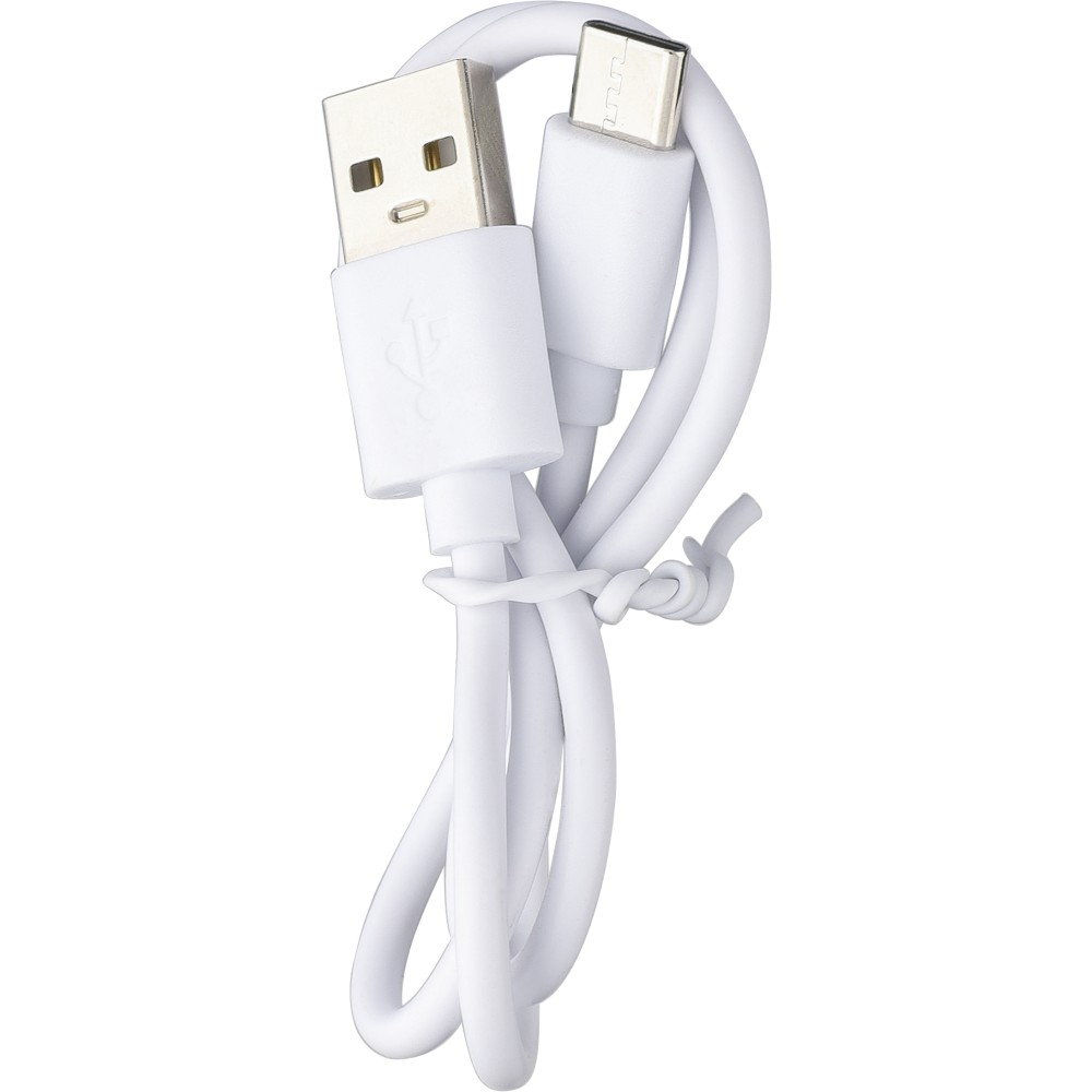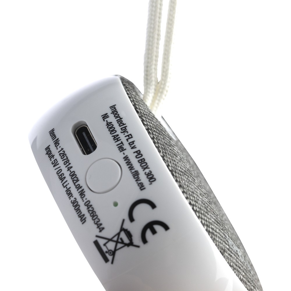 Újrahasznosított ABS és rPET anyagból készült vezeték nélküli hangszóró vékony nejlon hordozópánttal. 3 W teljesítmény, 300 mAh akkumulátor, 5.3-as vezeték nélküli technológia és 10 méteres hatótávolság. 30 cm-es fehér USB-C töltőkábellel. Az anyagon rPET logóval, az oldalán pedig újrahasznosított ABS logóval. Egyenként csomagolva, barna kartondobozban.