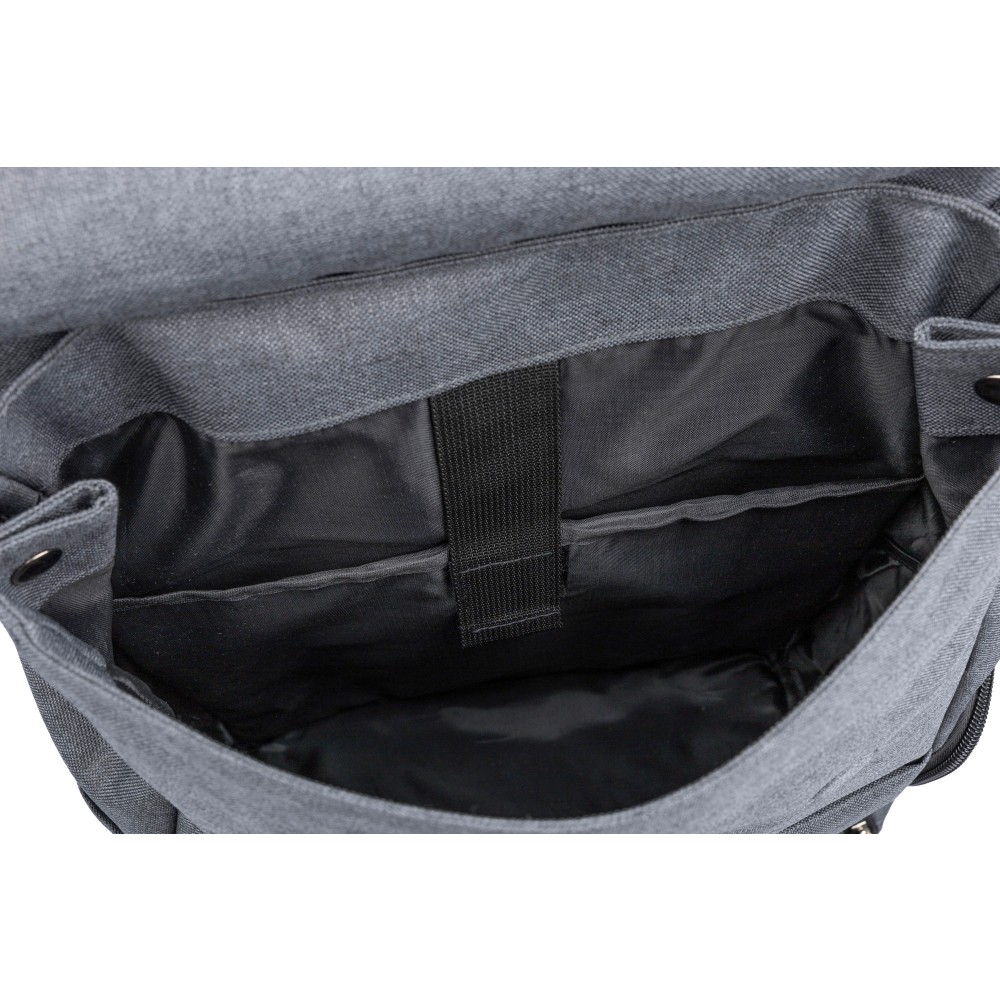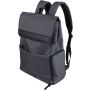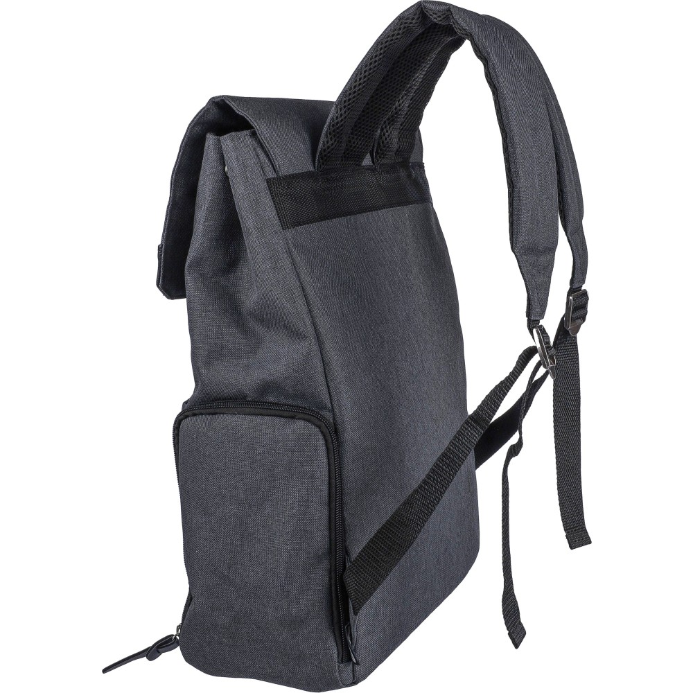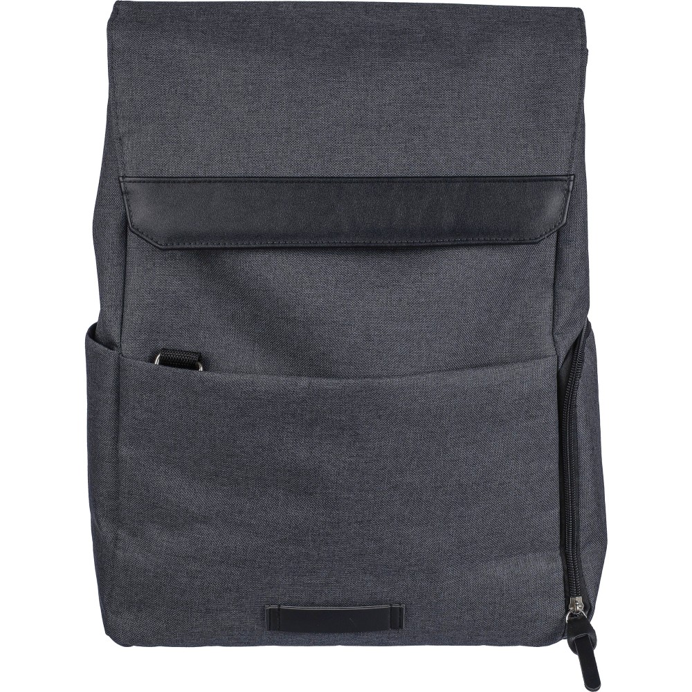 Laptophátizsák 15"-es laptop számára, PVC részletekkel és 210D béléssel. Kis cipzáras elülső zsebbel rendelkezik, benne egy kulcsokhoz rögzíthető karabinerrel, egy cipzáras oldalzsebbel, egy normál oldalzsebbel, valamint egy nagy, mágneszáras rekesszel, amely laptopzsebet tartalmaz. Oldalt nyomógombokkal zárható, ha nincs teljesen megtöltve. Állítható, szellőző pántokkal. Az elülső részen rPET anyagra utaló címke található. Anyaga: 600D poliészter vászon.