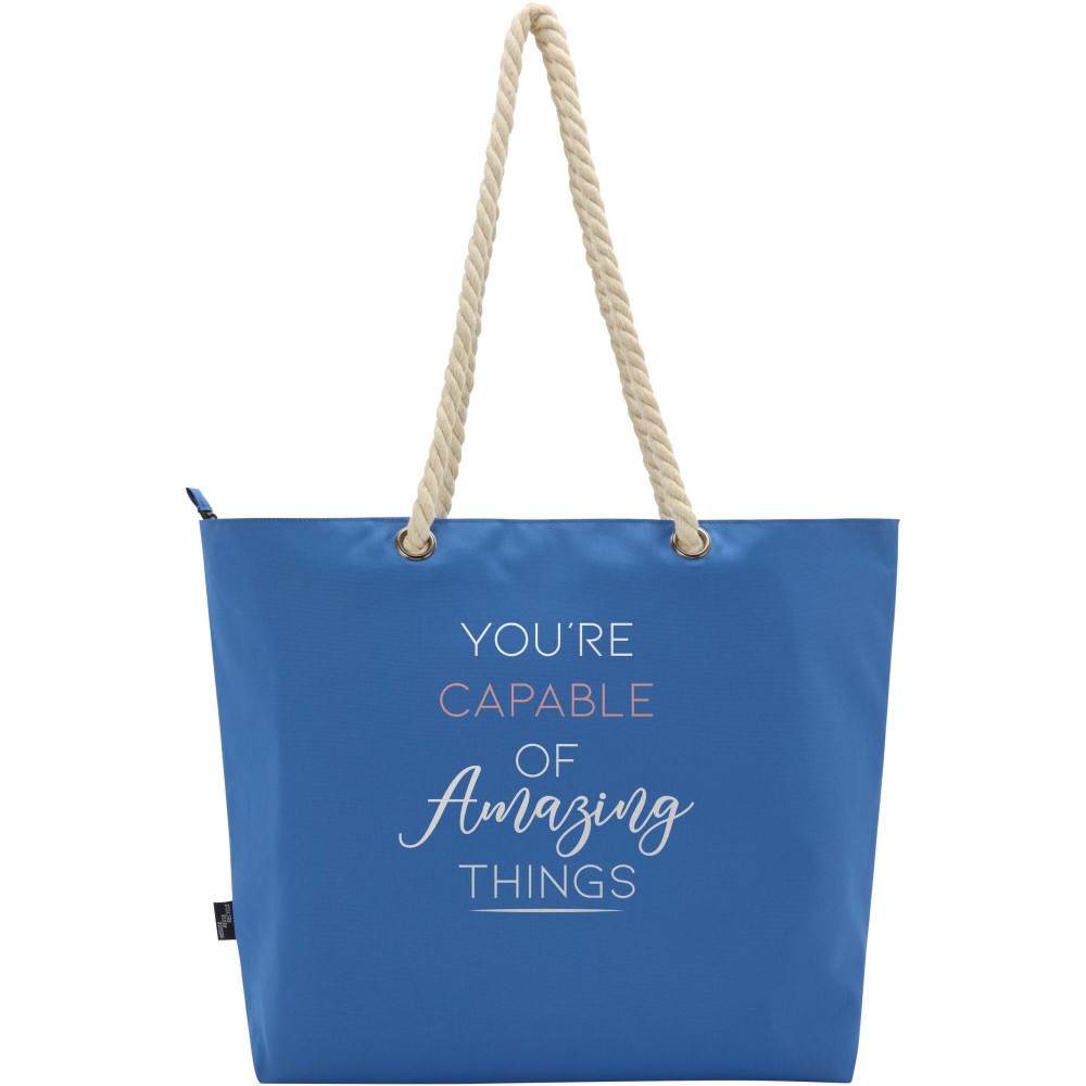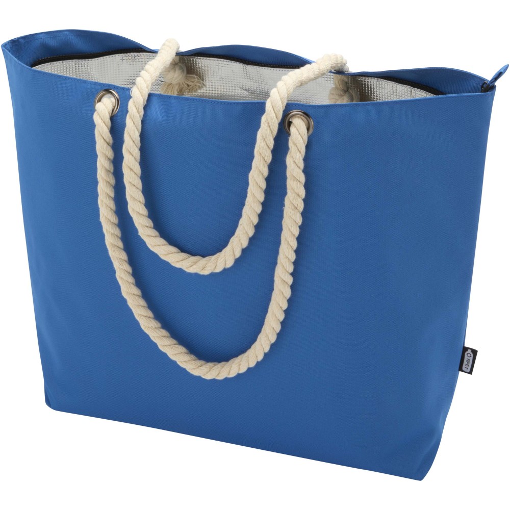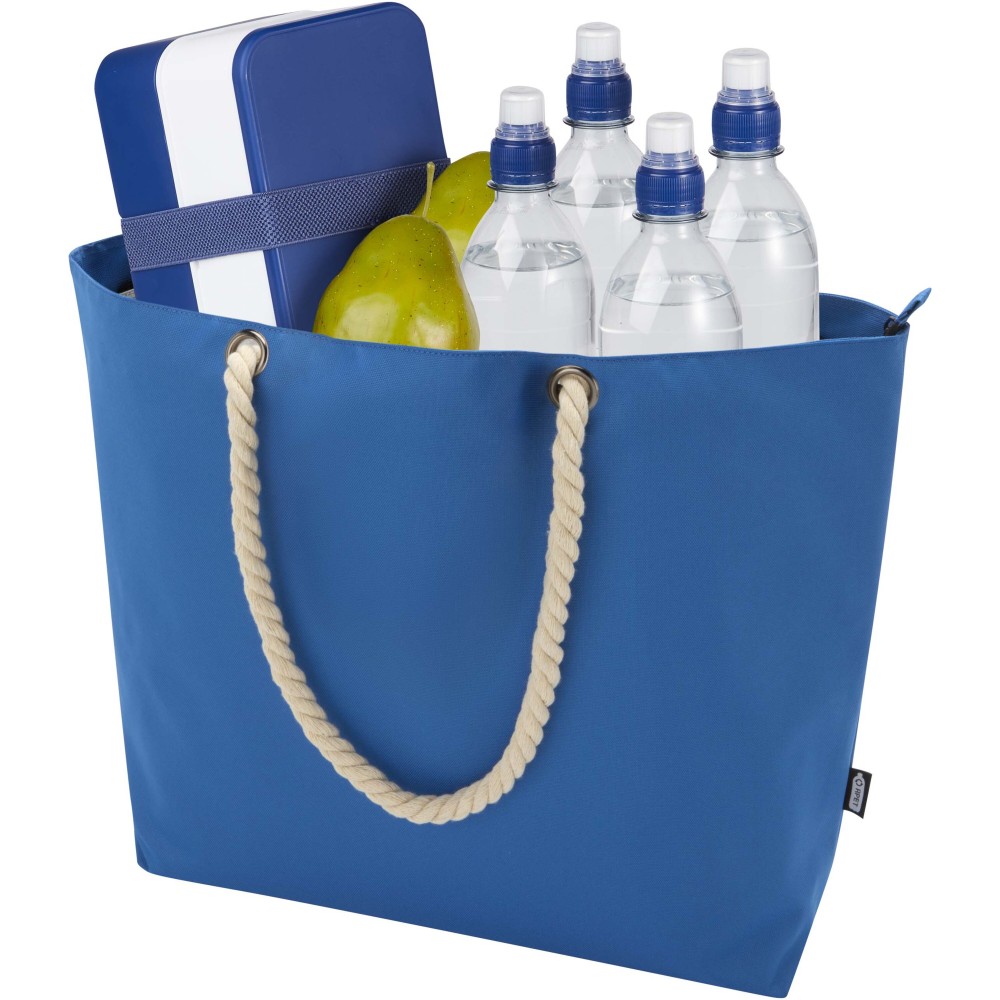 A Panama hűtőtáska GRS tanúsítvánnyal rendelkező újrahasznosított poliészterből készült, és nagy, cipzáras főrekesszel van ellátva. Kiváló minőségű alumínium fóliával bélelt belső résszel és pamut fülekből áll. Ideális bevásárláshoz, strandoláshoz vagy egy parkbéli kiránduláshoz. Űrtartalma: 23 liter. Teherbírás: akár 10 kg. PVC-mentes.