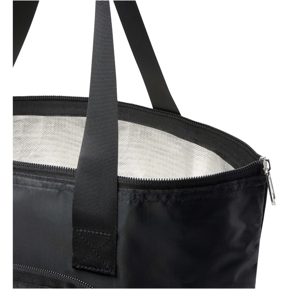 Ez a könnyű, mégis tartós hűtőtáska a kényelem és praktikusság jegyében készült, és könnyedén a kompakt tasakba hajtható, amelyen hurok található a kényelmes hordozás érdekében - tökéletes piknikhez, bevásárláshoz vagy szabadtéri programokhoz. Cipzáras, alumínium fóliával bélelt főrekesszel, nyitott elülső zsebbel és két hosszú, sima szövött anyagból készült fogantyúval rendelkezik. PVC-mentes újrahasznosított poliészterből készült. Űrtartalma: 15 liter.