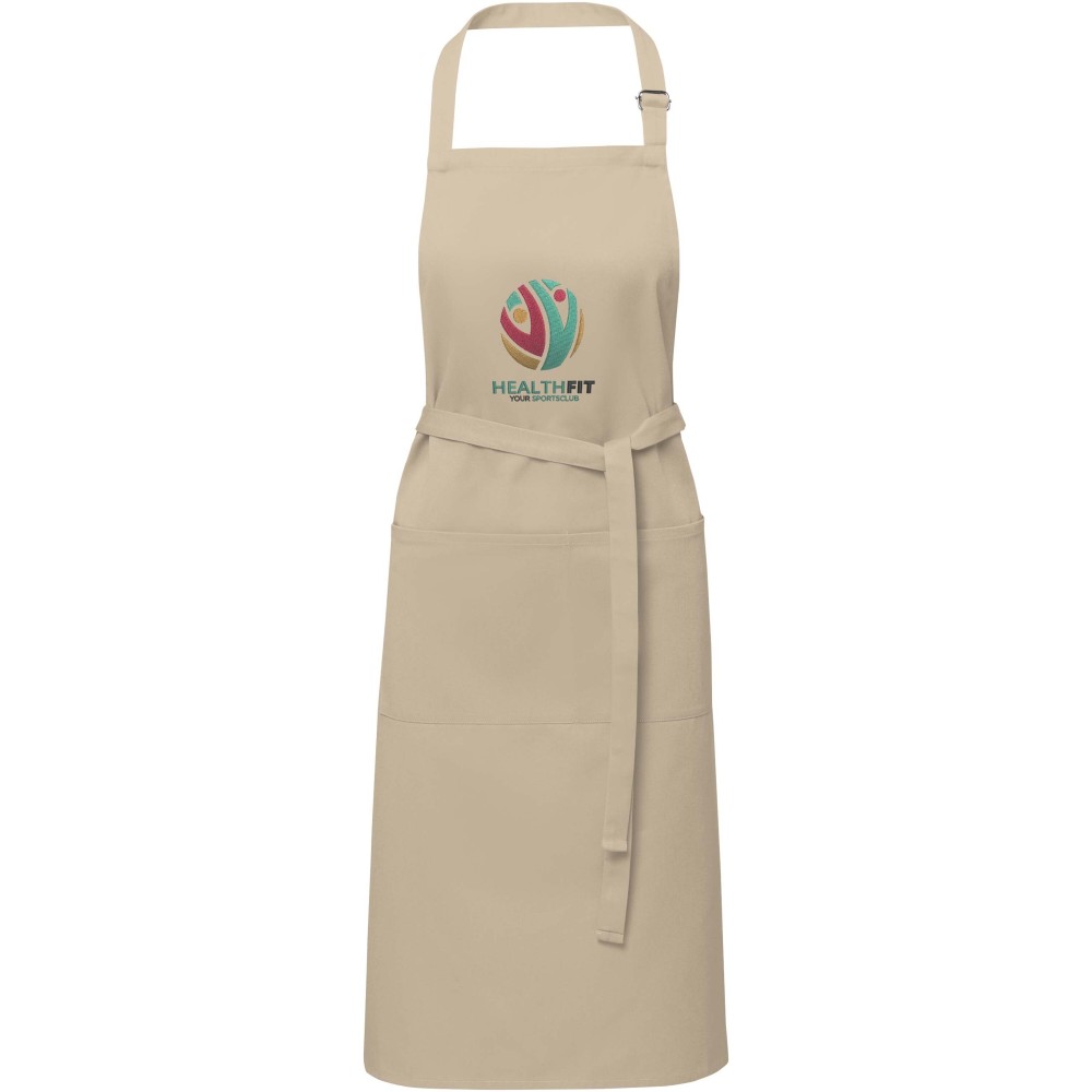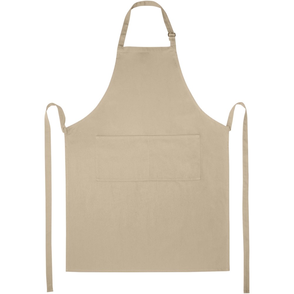 Vastag és masszív anyag, ugyanakkor puha és kényelmes viselet. A két elülső zseb gyors és egyszerű módot kínál a konyhai eszközök tárolására. A kötény nyakában csattal állítható, hátul megköthető. Nagyméretű nyomtatási lehetőség a logók megjelenítéséhez. Pamut twill 65% poliészterből és 35% pamutból, 240 g/m2.