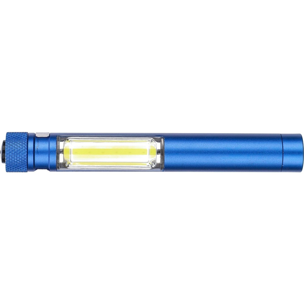COB zseblámpa (50 lumen) mágnessel az alján és fém zsebklipsszel. Tartalmaz elemeket. Egyenként fehér dobozba csomagolva. Anyaga: alumínium.