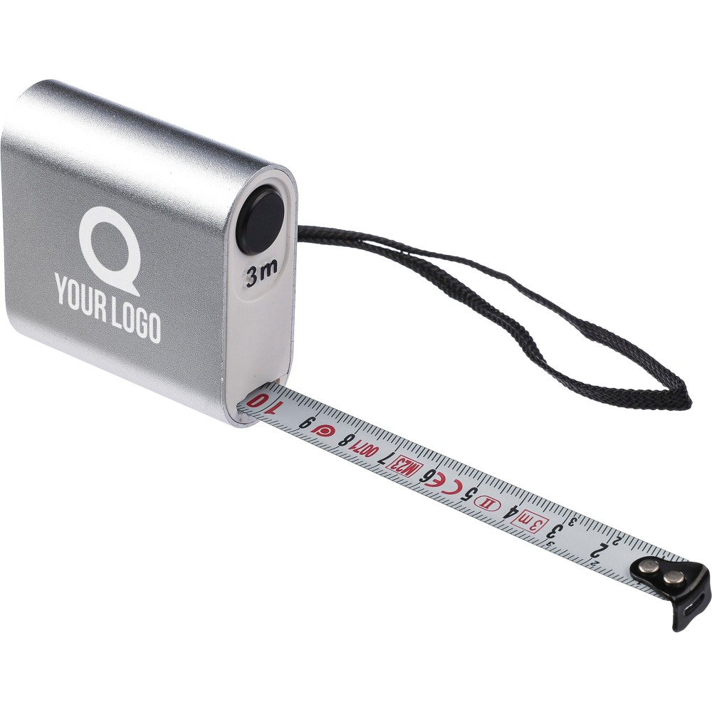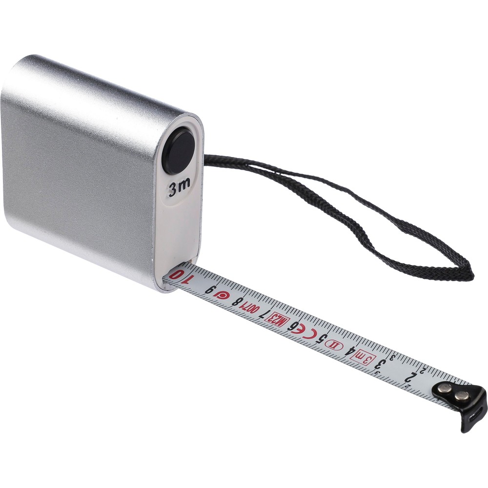 Mérőszalag. 3 méteres, nyomógombbal és centiméter beosztással, csuklópánttal. MID tanúsítvánnyal rendelkezik. Egyenként barna kartondobozba csomagolva. Anyaga: alumínium.