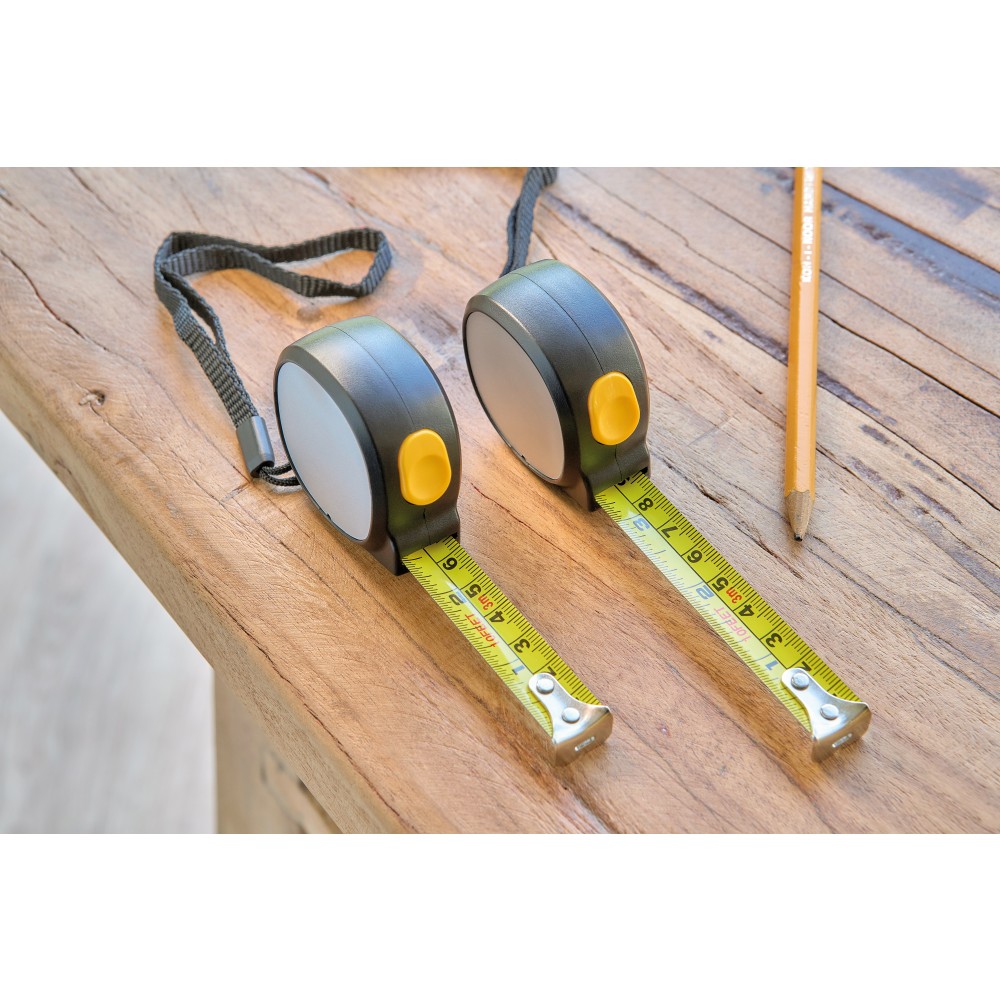 ABS műanyagból készült mérőszalag mágneses oldallal, 5 m hosszúságú és 19 mm szélességű fém szalaggal, centiméter- és inch-beosztással. Felül elhelyezett nyomógomb a rögzítéshez/kioldáshoz, valamint poliészter csuklópánt. Egyenként csomagolva illusztrációval ellátott barna kartondobozban.
