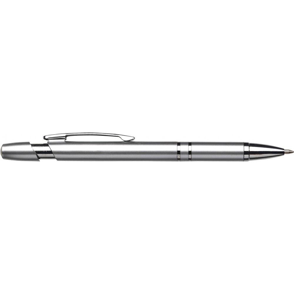 Műanyag golyóstoll metálos fényű tolltesttel, króm kiegészítőkkel, kék tollbetéttel.