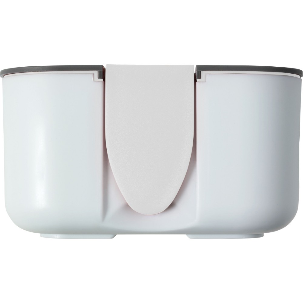 Ételdoboz egy belső elválasztóval. A fedélen lévő zárószerkezet telefontartóként is használható. Fedél nélkül mikrózható, csak a doboz. Űrtartalom: 850 ml. PP BPA-mentes műanyag.