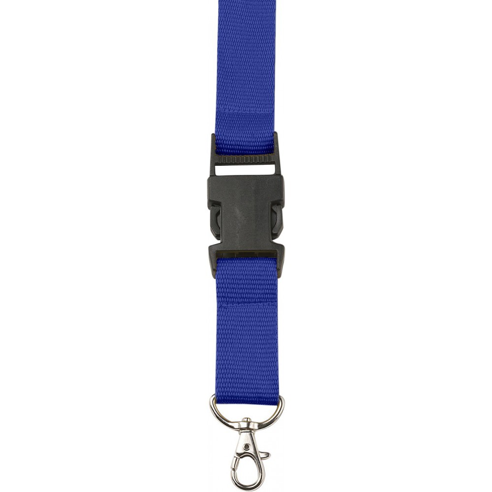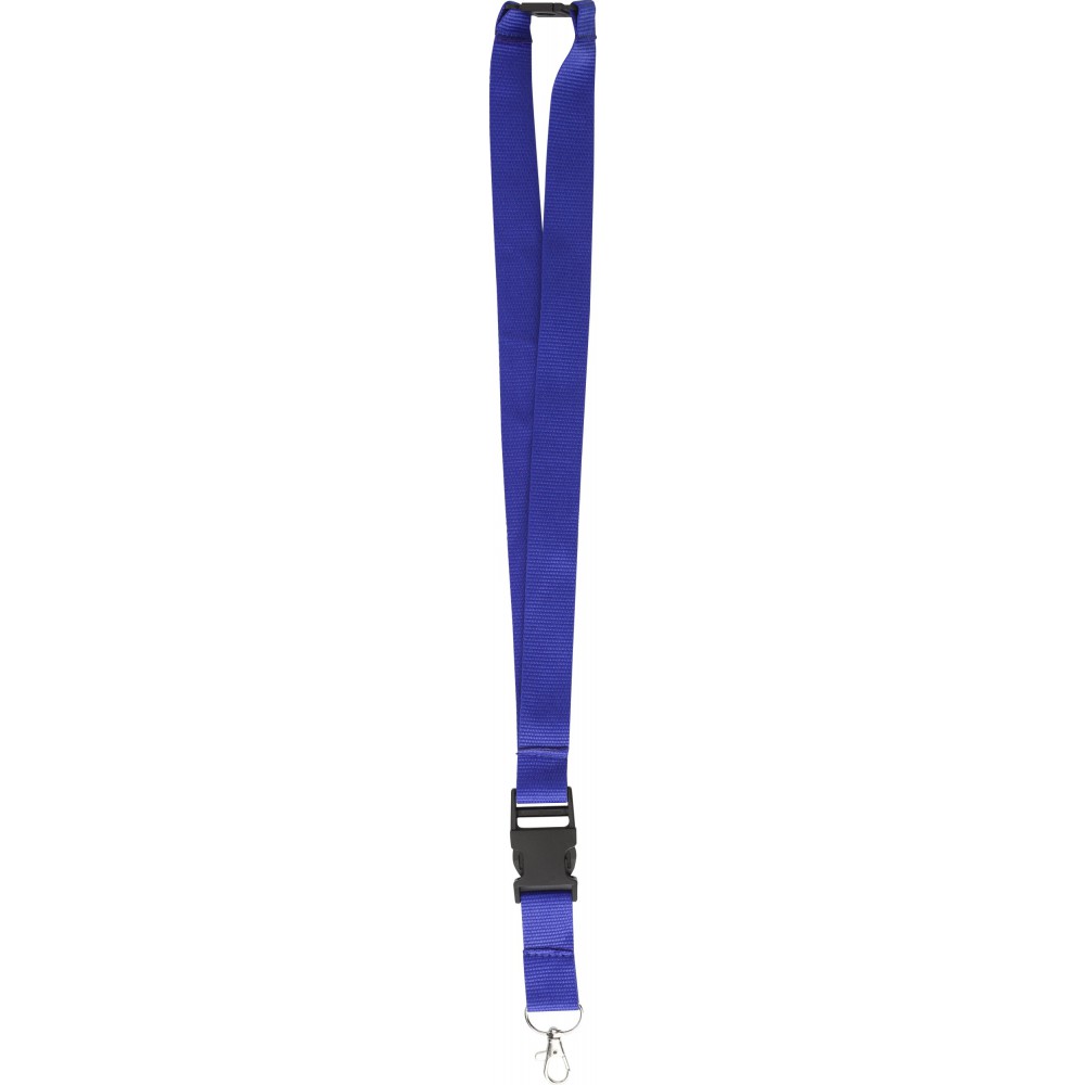 Nyakpánt cseppkarabinerrel és leoldható résszel. Késztermék, teljes felülete nem emblémázható. 300D poliészter.