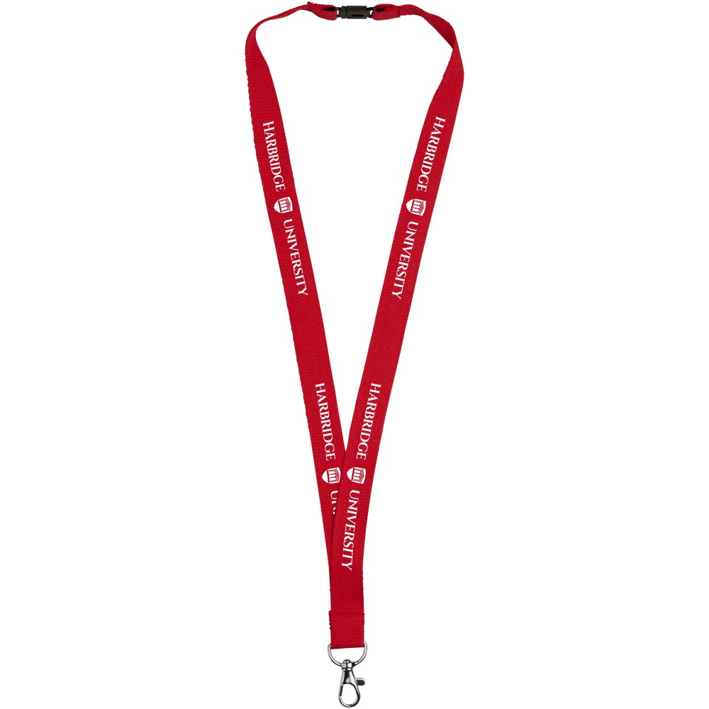 Nyakpánt biztonsági kioldóval. 100% pamut. Kiváló ár-érték arányt és lenyűgöző logóméreteket kínál, ha zöld megoldást keres. Kiváló minőségű karabinerrel, ideális névjegy-, ID- vagy kulcsok tartására.