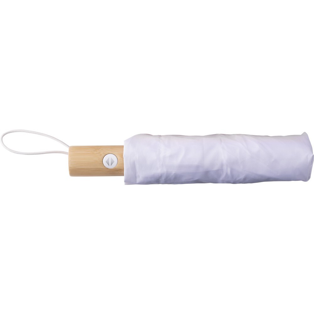 RPET összecsukható esernyő nyolc panellel, tépőzárral és bambusz fogantyúval, tokkal. Automatikus nyitó- és záró gombbal. Zárt méret: 29 cm.