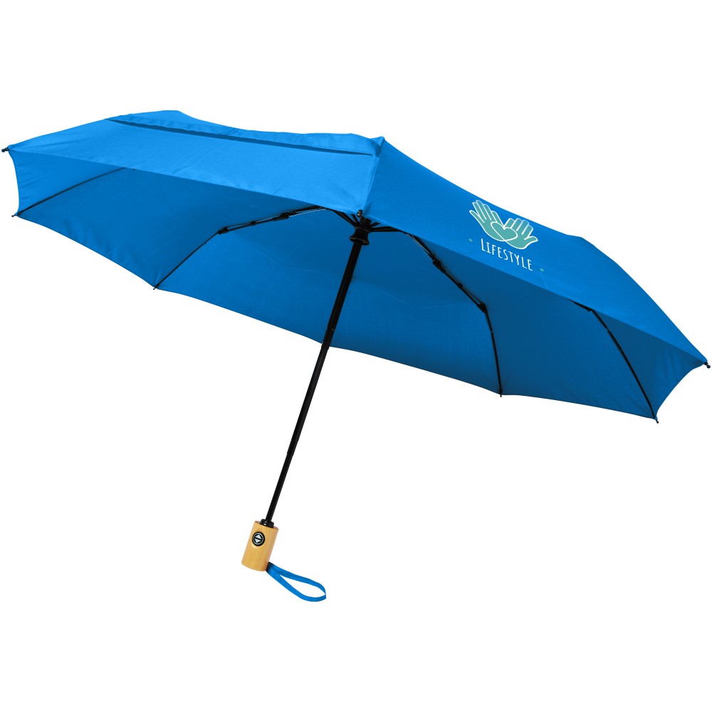 Összecsukható 21 -es esernyő. Erős fém váz, üvegszálas szerkezet. Fa nyele és az újrahasznosított RPET alapanyag miatt jó választás azok számára, akiknek fontos a fenntartható szemlélet.
