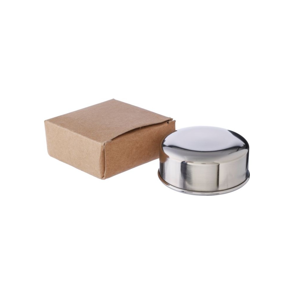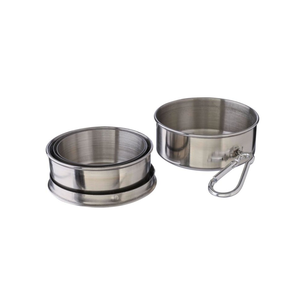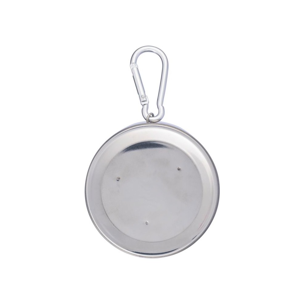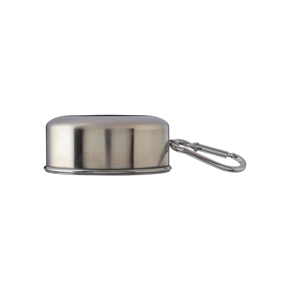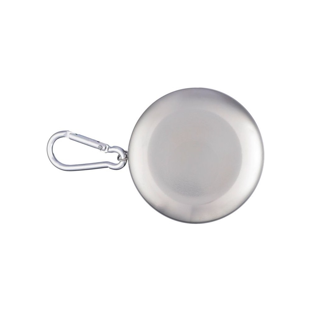 Összecsukható pohár fém karabinerrel. Egyenként barna kartondobozba csomagolva. Anyaga: rozsdamentes acél. Űrtartalom: 220 ml.