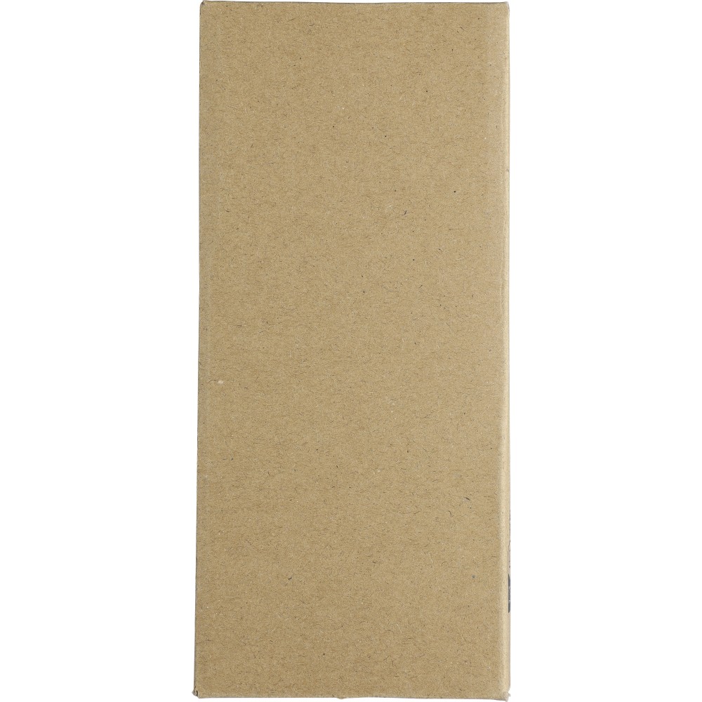 Újrahasznosított ABS és rPET anyagból készült powerbank 10.000 mAh kapacitással, dual USB és USB-C porttal (5V/2.4A), töltéskijelzővel, tetején rPET logóval. 30 cm-es kábel tartozik hozzá. Csomagolása kraftpapír doboz.