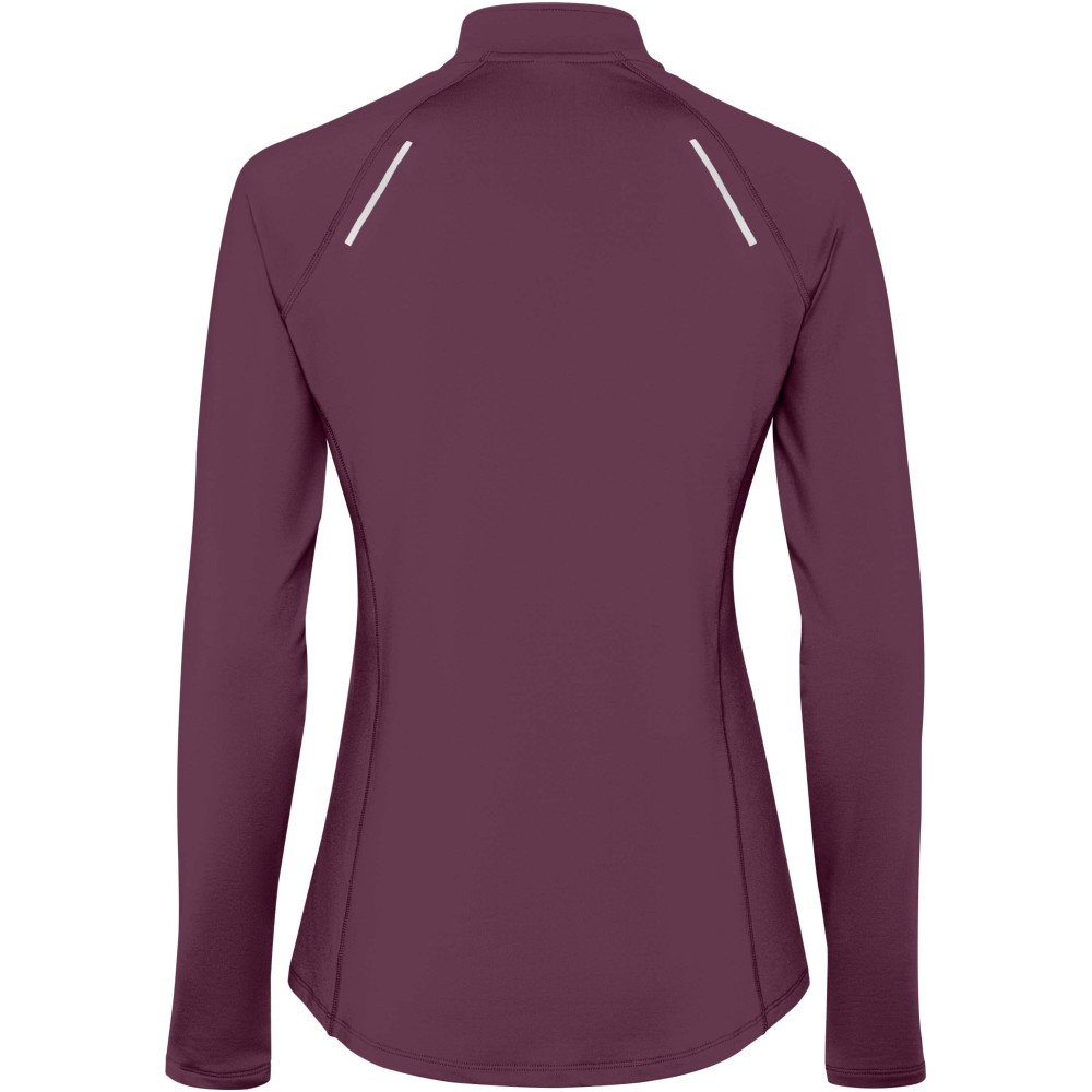 Női hosszúujjú technikai raglán pulóver. Gallér fordított félcipzárral, fényvisszaverő részletekkel. Erősített varrások. Kézelő hüvelykujj nyílással. Fényvisszaverő részletek a háton. A hátul enyhén hosszított fazon. Meleg, bolyhos belső anyag.