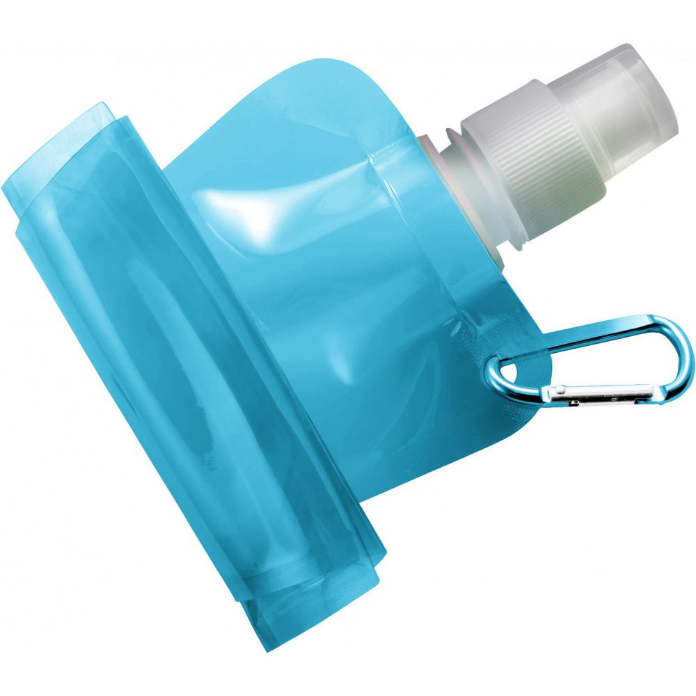 Összehajtható vizeskulacs karabinerrel. Nem szivárgásmentes. Mosogatógépben nem tisztítható. 420ml. BPA-mentes műanyag.
