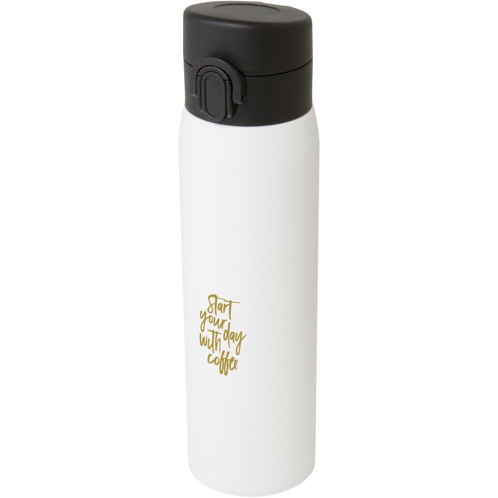 Stílusos, RCS tanúsítvánnyal rendelkező újrahasznosított rozsdamentes acélból készült, szigetelt palack gombos nyitómechanizmussal. A flaska szivárgásmentes és a réz vákuumszigetelésnek köszönhetően az italokat több órán keresztül forrón vagy hidegen tartja. Űrtartalom: 450 ml. Újrahasznosított kartonból készült díszdobozban szállítjuk.