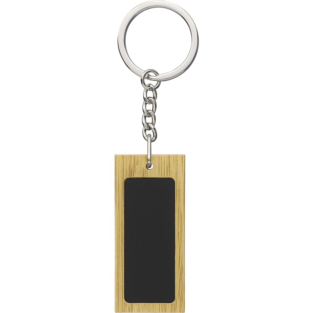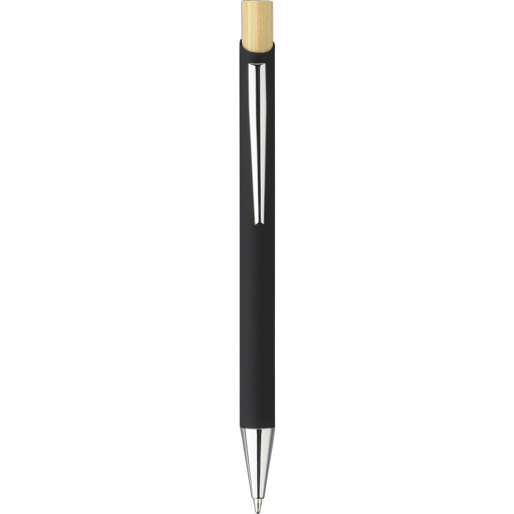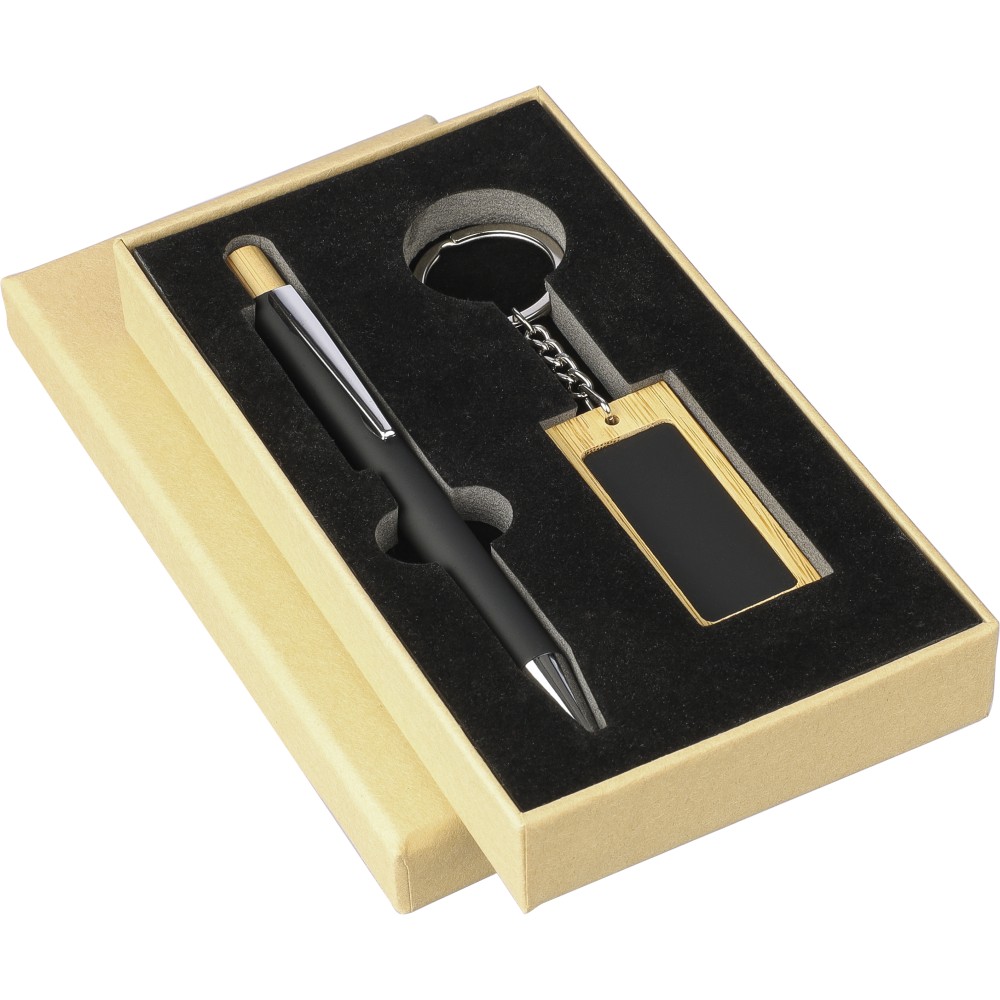 Bambusz írószerkészlet, amely egy bambuszból és gumírozott, újrahasznosított alumíniumból készült golyóstollat tartalmaz kék tintával, bambusz nyomógombbal és krómozott műanyag heggyel. Bambuszból és gumírozott rozsdamentes acélból készült téglalap alakú kulcstartóval. Mindkét termék felülete lézergravírozás után tükörhatású lesz, és újrahasznosított alumínium logóval van ellátva. Bársonyberakásos, kraftpapír dobozban csomagolva.
