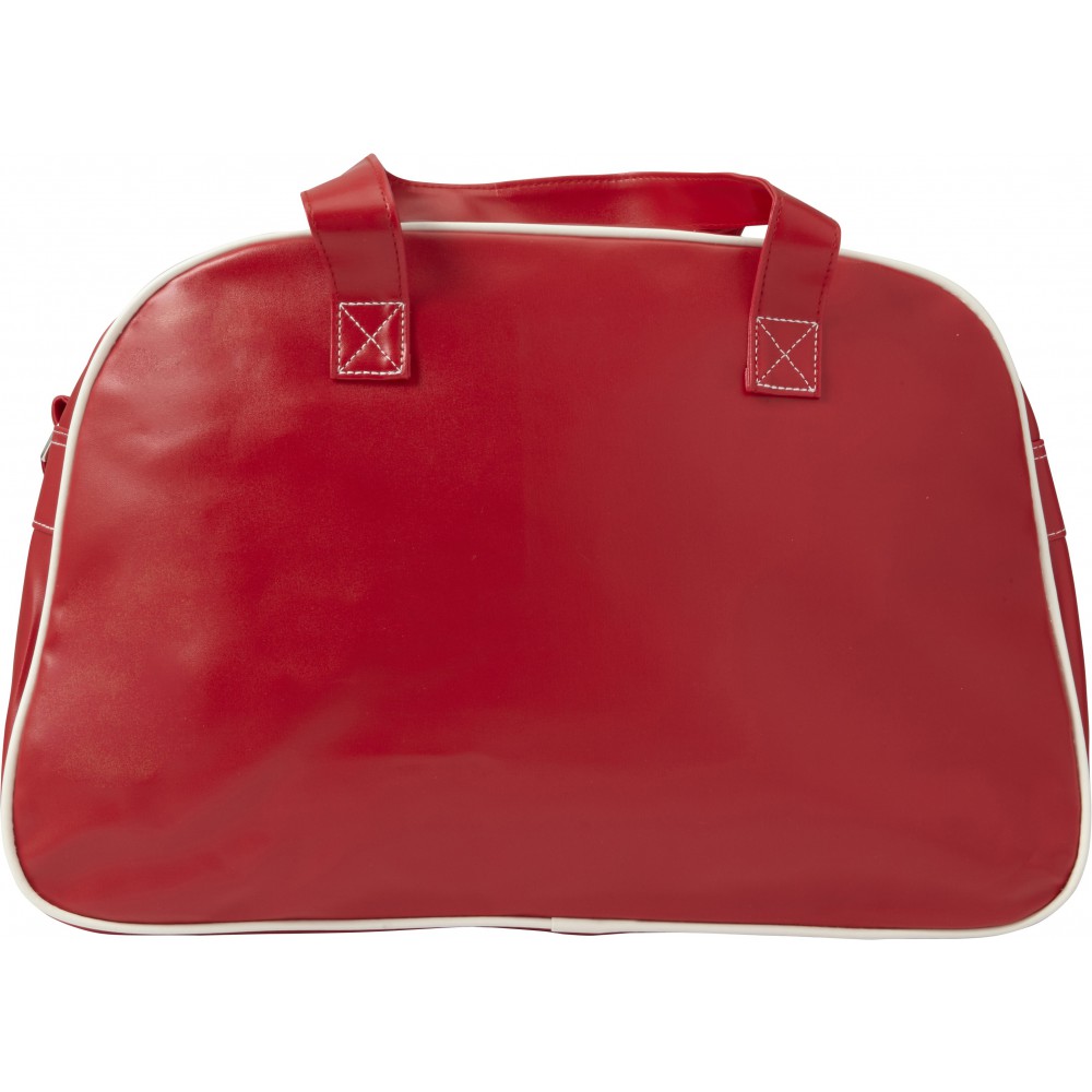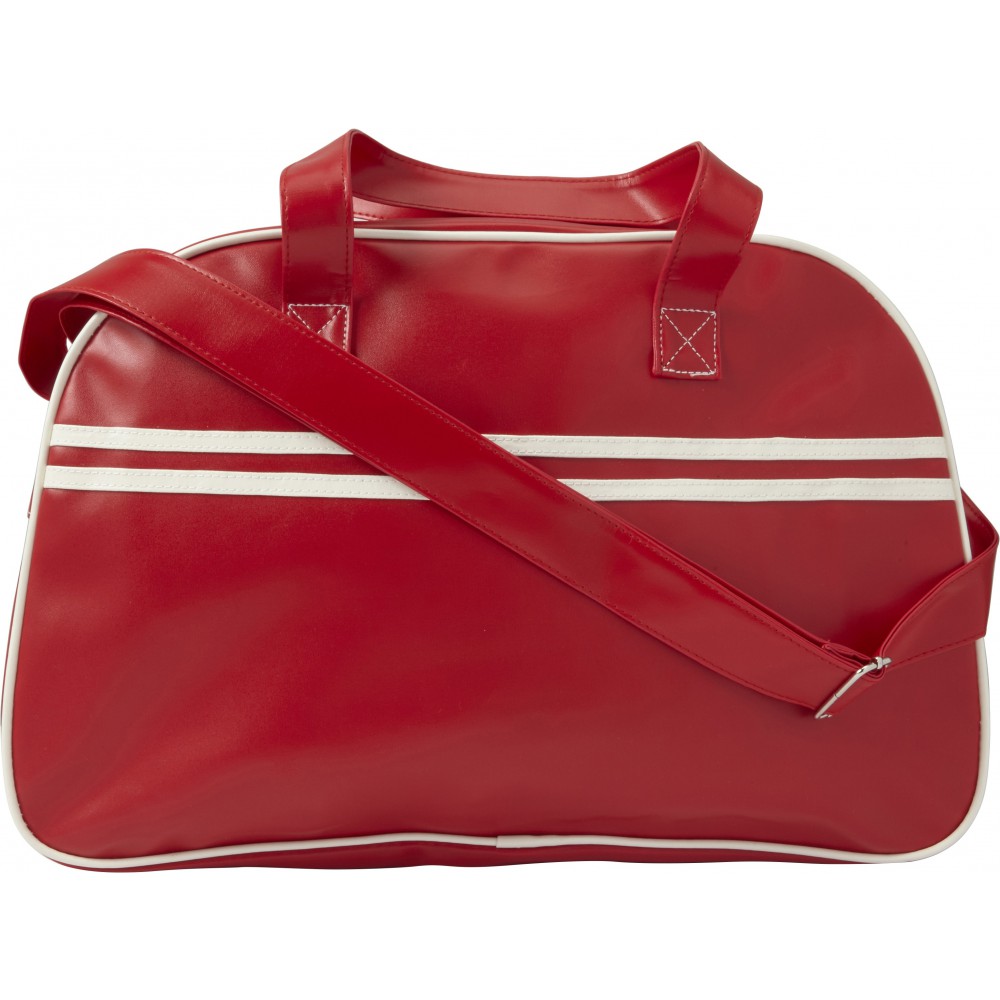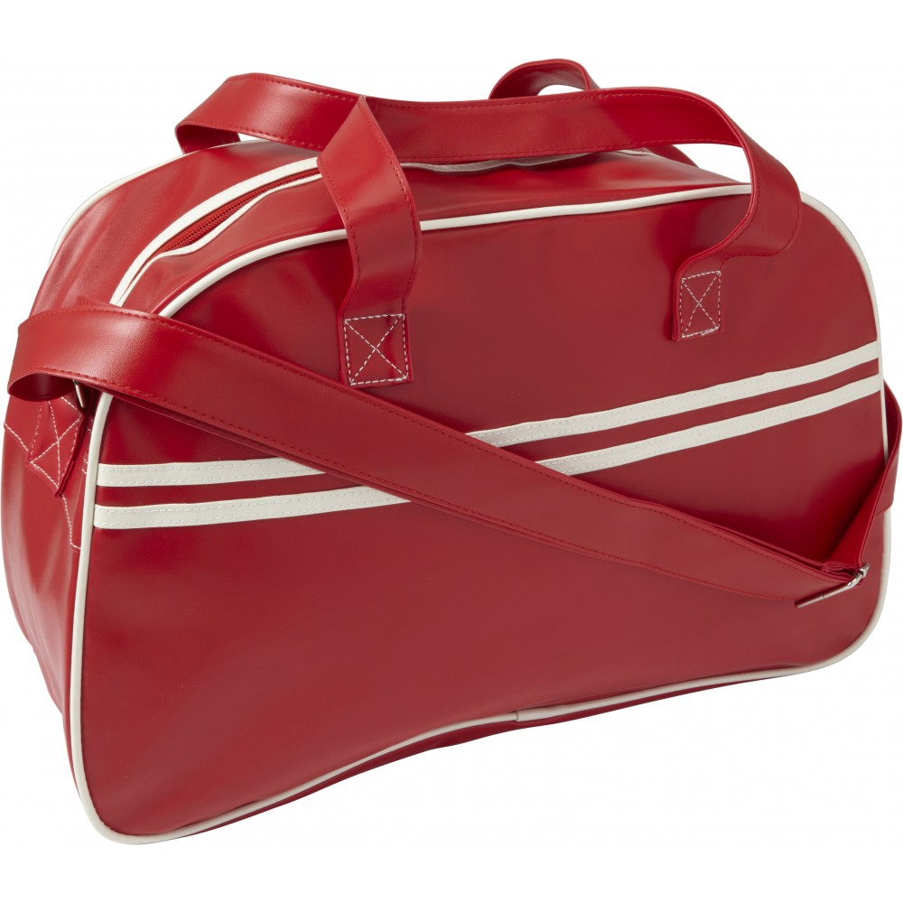 Sporttáska fehér csíkokkal és szegéllyel, állítható vállpánttal. PVC.