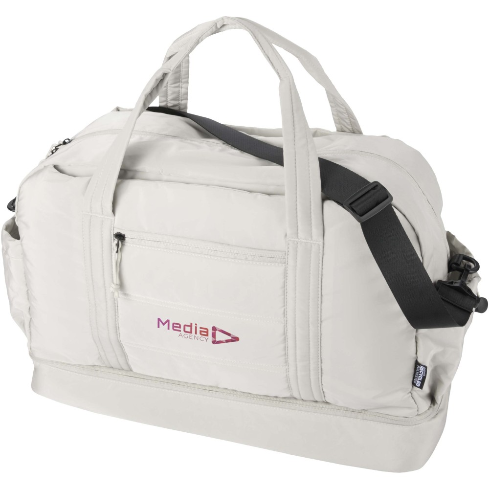 A Puffer sporttáska egyedi megjelenést ötvöz prémium minőségű, GRS tanúsítvánnyal rendelkező újrahasznosított alapanyagokkal, így ideális választás a mindennapi használathoz. A 30 literes űrtartalom tökéletes rövid utazásokhoz, edzéshez vagy hétköznapi teendőkhöz. A táska tágas, cipzáras fő rekesszel rendelkezik ruhák és felszerelések számára, valamint egy szigetelt, PEVA bélésű alsó rekesszel, amely lehetővé teszi a nedves és száraz holmik elkülönítését. A több belső és külső zseb segíti az átlátható rendszerezést, míg a bőröndre rögzíthető pánt, az állítható vállpánt és a kézifogantyúk sokoldalú hordozási lehetőséget biztosítanak. Könnyű és vízlepergető kialakításának köszönhetően ez a sporttáska könnyedén alkalmazkodik az életviteledhez.