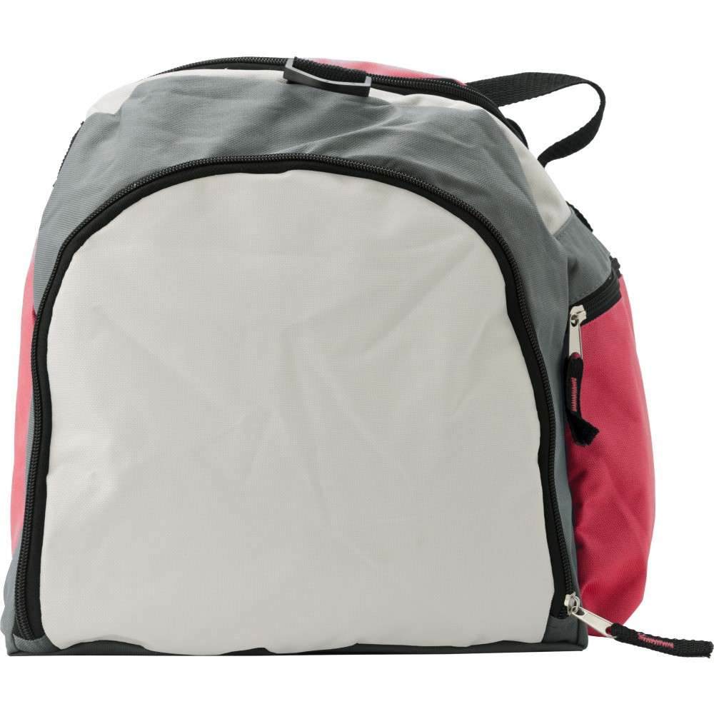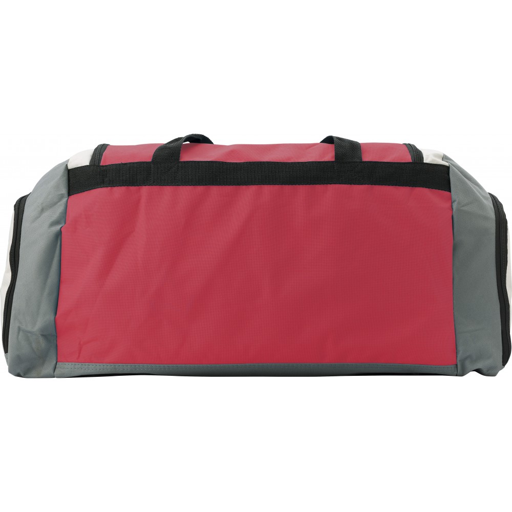 Nagy sporttáska két cipzáras zsebbel a táska végén és egy zsebbel az elején, állítható vállpánttal.