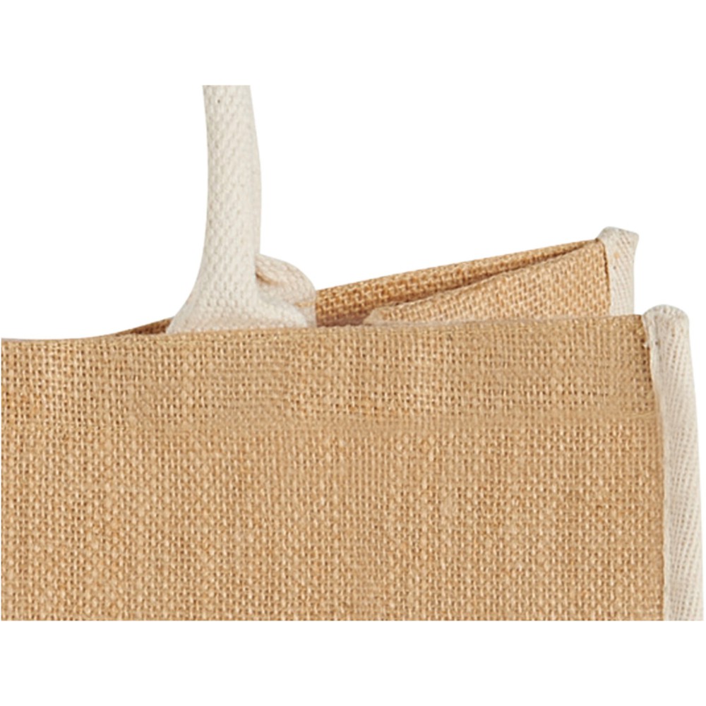 The Large juta bevásárlótáska tépőzáras kialakítással. A lehajtható fülek magassága 17 cm. Megjegyzés: finom grafikát vagy szöveget nem, csak vastag, erős nyomatott lehet az anyagon alkalmazni. Juta.